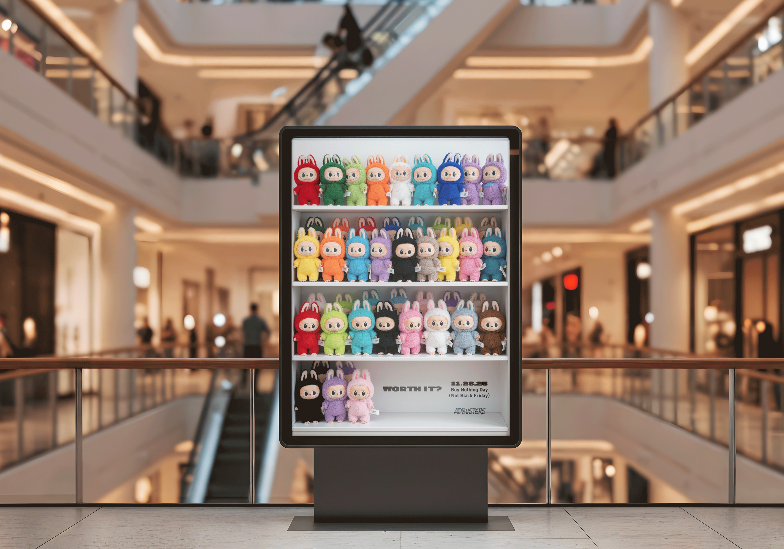 Worth It? is a poster campaign promoting Buy Nothing Day and raising awareness about the obsessive nature of consumer buying habits. Shelved products (including stacks of fast fashion brands, Labubu dolls, and iPhones) represent this obsession, which is on full display during the Black Friday promotion season. These products are showcased alongside the copy line and call to action: "Worth It? 11.28.25. Buy Nothing Day (Not Black Friday)." The goal of the poster series is to communicate the message in the most cost-effective manner. The posters are therefore placed in high-traffic outdoor areas where many people can interact with the work, including public transit spaces, shopping centers, and recreational parks.